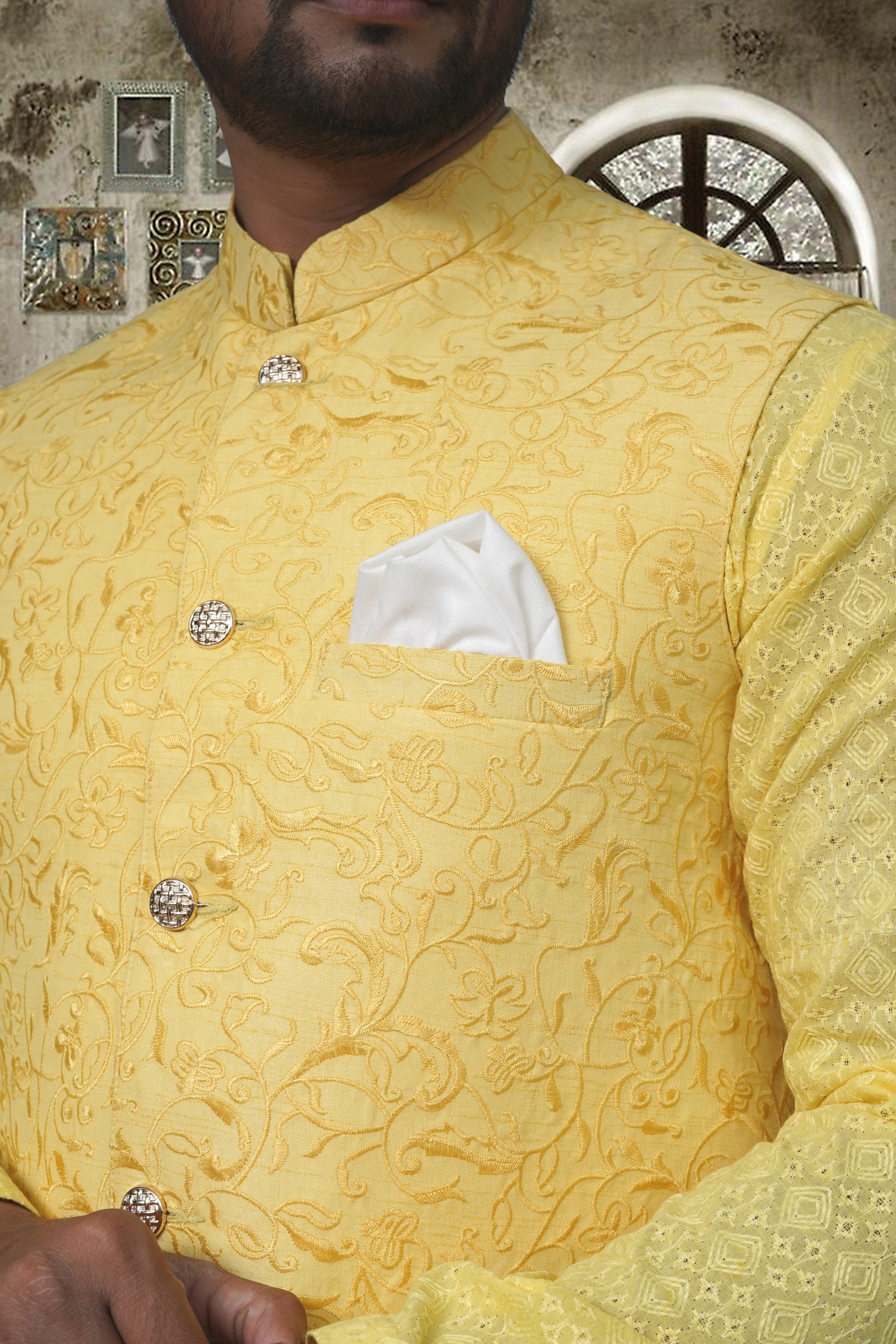 Radiate festive charm with our Embroidered Yellow Waistcoat, crafted from premium fabric and detailed with fine traditional embroidery. The vibrant yellow hue embodies joy and celebration, making it the perfect choice for Mehndi and Mayo occasions. Designed for the modern man who values heritage with style, this waistcoat adds a touch of refined elegance to every festive ensemble.