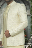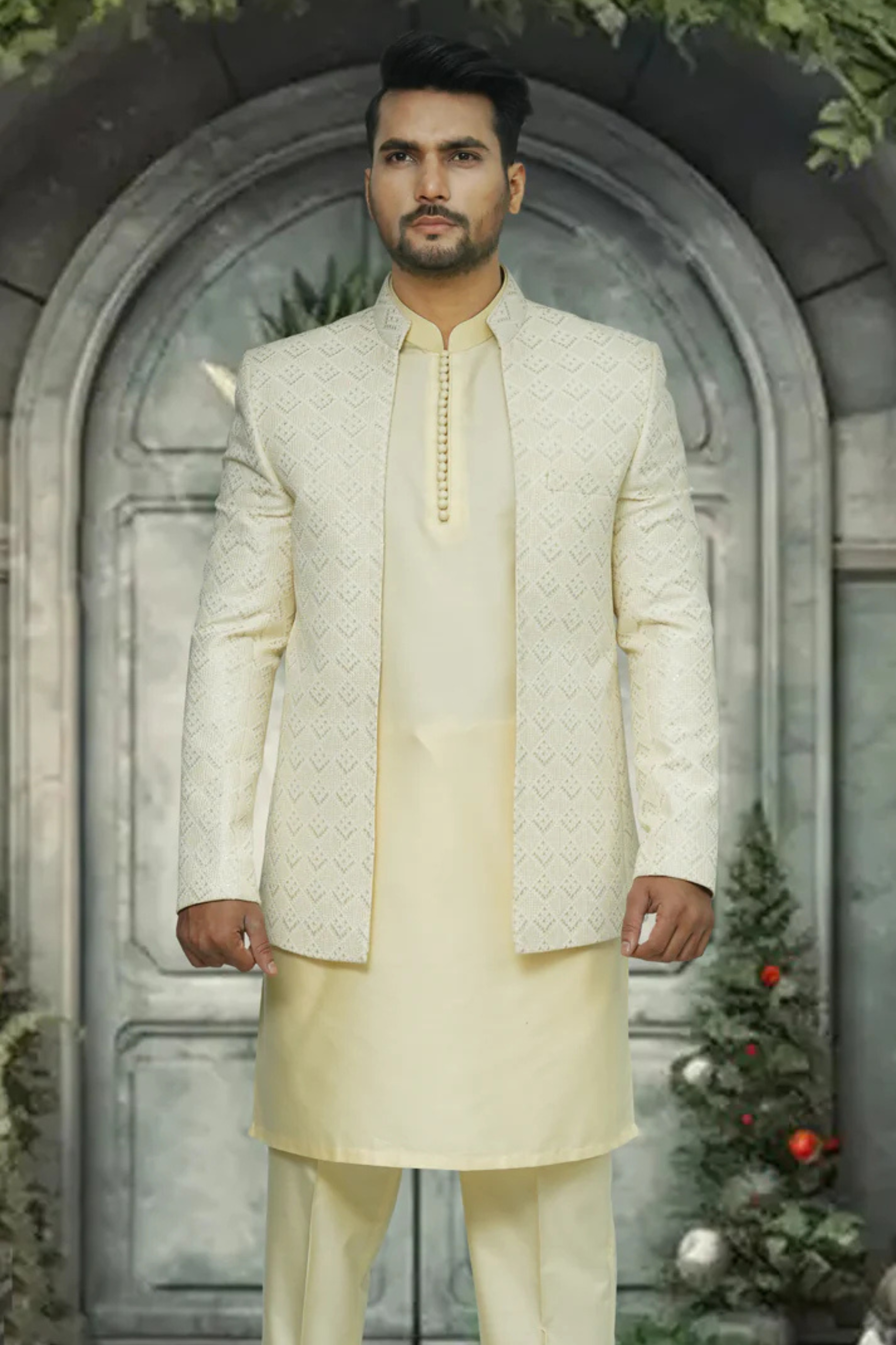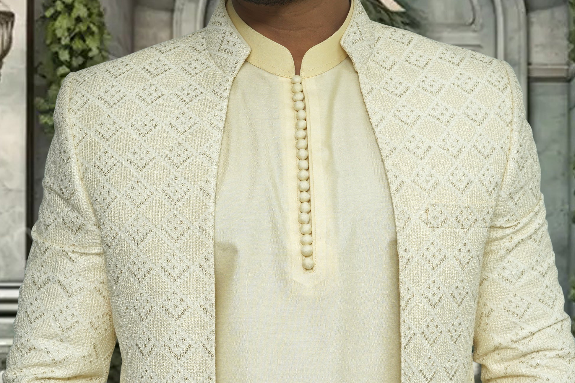 Exude effortless sophistication with our Open Prince Coat in elegant Pearl White. Tailored from premium embroidered fabric, this statement piece reflects refined craftsmanship and timeless style. Its open-front design adds a touch of contemporary grace, making it an ideal choice for weddings, receptions, and formal gatherings. Perfectly balancing tradition and modernity, it defines luxury with understated elegance.