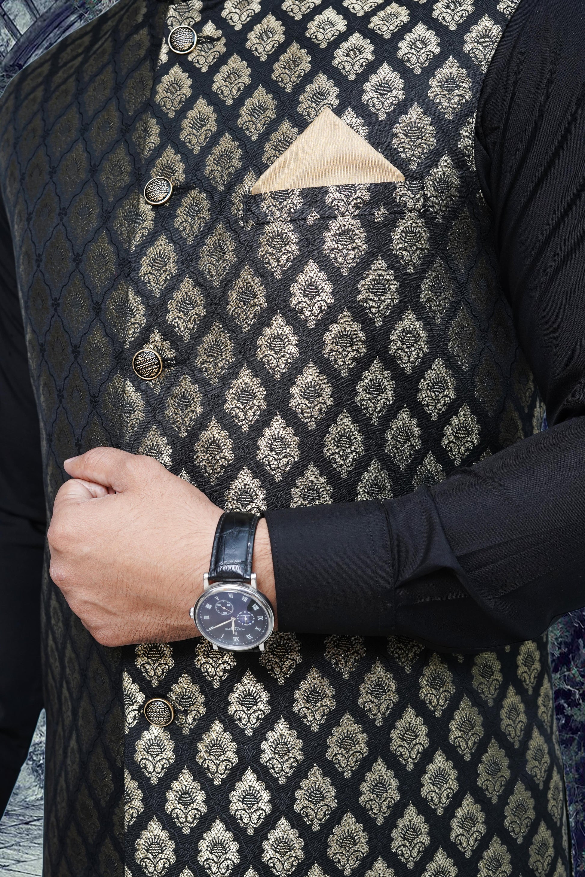 Elevate your festive look with our Black & Golden Waistcoat, a perfect blend of tradition and sophistication. Crafted from rich embroidered fabric, it features intricate golden detailing that beautifully complements the deep black base. Ideal for weddings and other traditional celebrations, this waistcoat exudes royal charm and timeless elegance — a true statement of refined style.