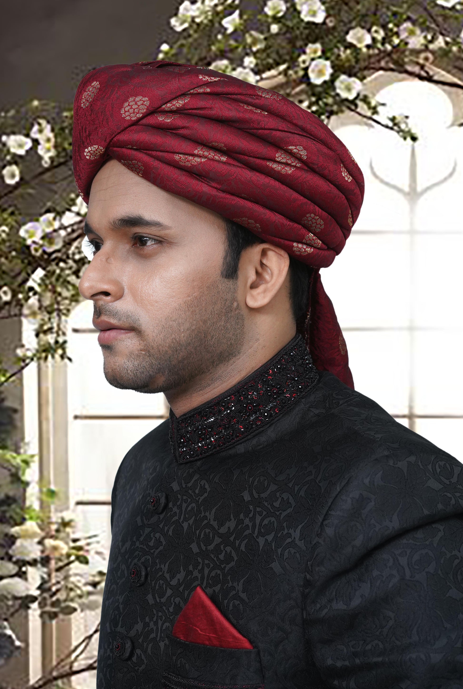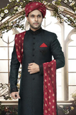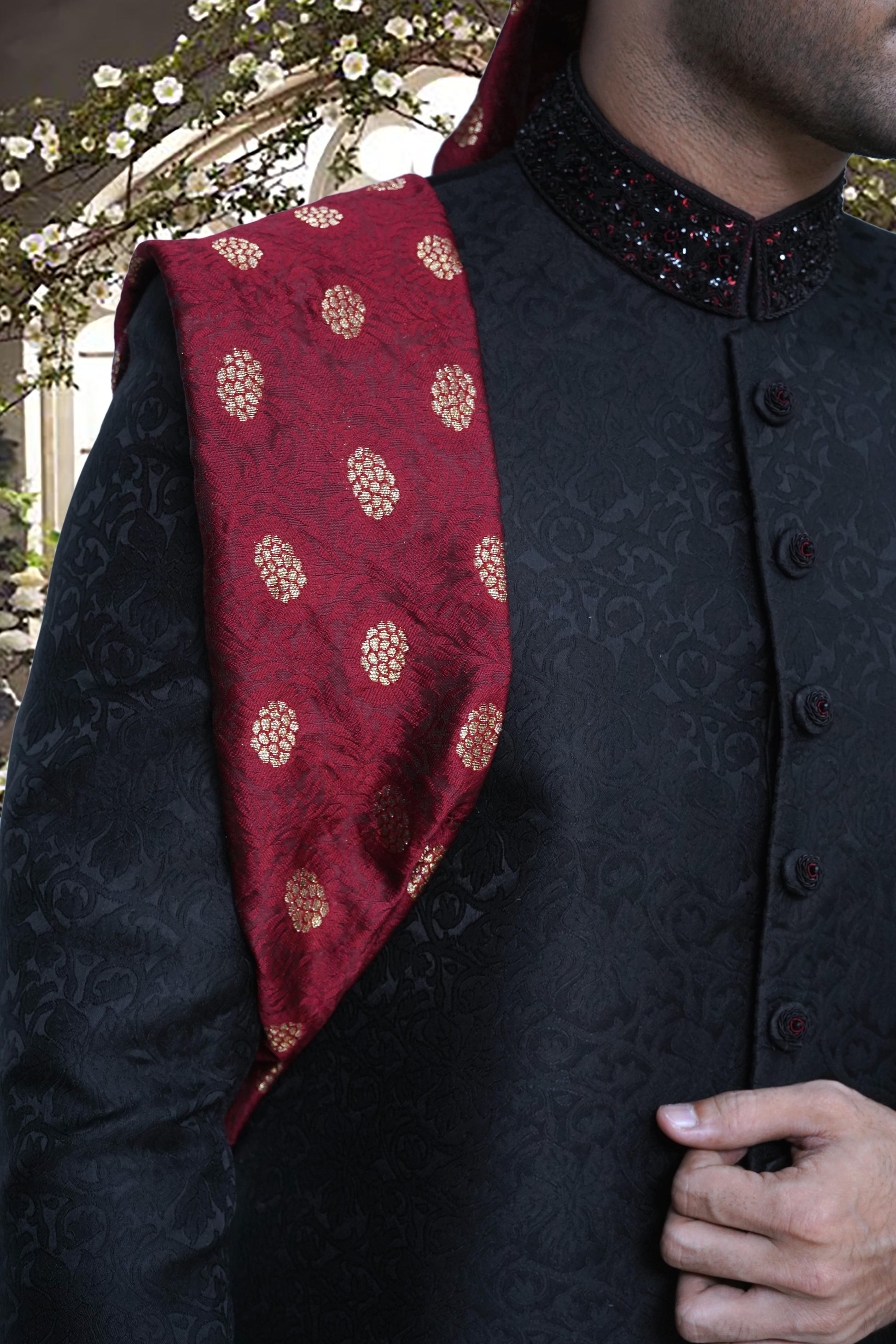 Command attention with our Black Jamawar Sherwani, a fusion of regal tradition and modern sophistication. Crafted from rich Jamawar fabric, it features exquisite hand embroidery on the collar, sleeves, buttons, and pocket, showcasing masterful artistry. Designed for the modern groom, its deep black tone and intricate detailing exude power, poise, and timeless elegance — perfect for grand occasions and wedding celebrations.